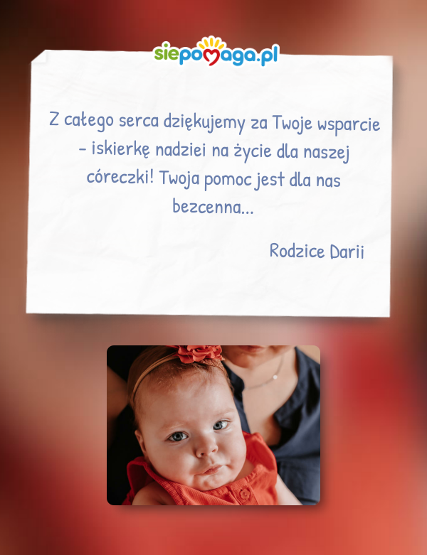 9-miesięcznej Daria chorej na SMA1 - rdzeniowy zanik mięśni. Rodzicom Dziecka życzymy powodzenia w zgromadzeniu środków na terapie genową, a Dziewczynce dużo zdrowi i sił w walce z chorobą!