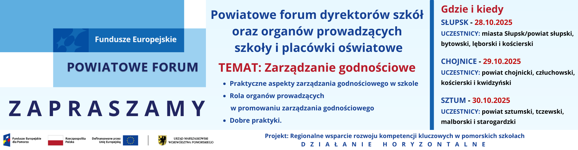 Zapraszamy do udziału w Powiatowych forach dyrektorów szkół oraz organów prowadzących szkoły i placówki oświatowe”. Fora są realizowane w ramach projektu: Regionalne wsparcie rozwoju kompetencji kluczowych w pomorskich szkołach, realizowanego przez Urząd Marszałkowski Województwa Pomorskiego i stanowią działanie horyzontalne przeznaczone dla wszystkich dyrektorów szkół i przedstawicieli jst odpowiedzialnych za oświatę województwa pomorskiego.